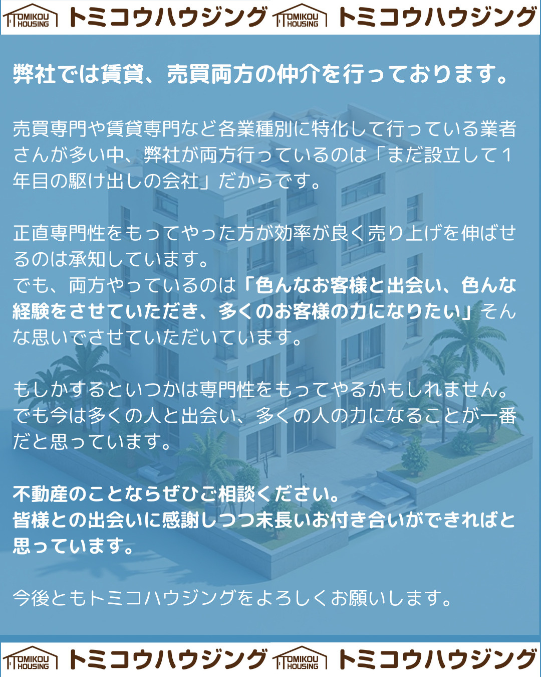以前問い合わせた不動産屋さんで嫌な思いをされた経験から、お部屋探しに消極的な感じでしたが、弊社にお問合せ頂いて感じが良かったので本当に良かったと感謝の言葉を頂きました。