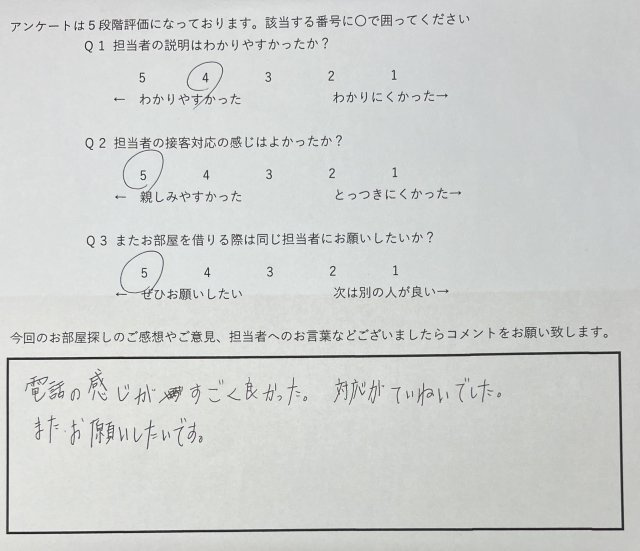 電話の感じがすごく良かった。対応がていねいでした。